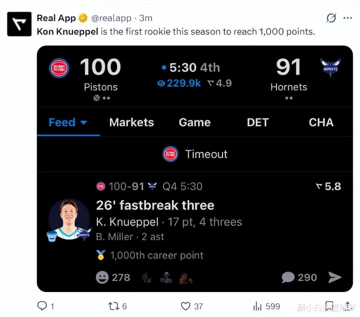 在小节还剩5分30秒,克努佩尔掷中第五个三分球,他也凭借这第五个三分球杀青了少壮1000分里程碑。
